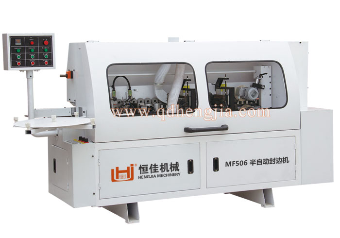 MF506半自动封边机工作流程:涂胶-送带-压紧-切断-精修-刮边