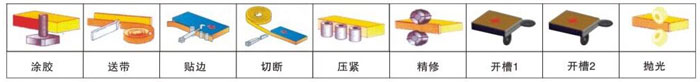 MF511开槽封边机主要工作流程为:涂胶,送带,贴边,切断,压紧,精修,开槽1,开槽2,抛光。
